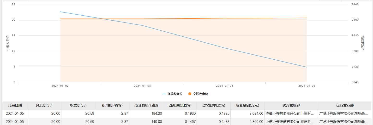 1月5日大宗交易成交324.2万股,成交额6484万元,占当日总成交额的28.41%,成交价20元,较市场收盘价折价2.87%。