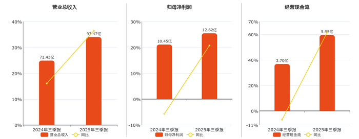 公司营业总收入为97.47亿元。归母净利润为12.62亿元。经营活动现金净流入为5.98亿元。