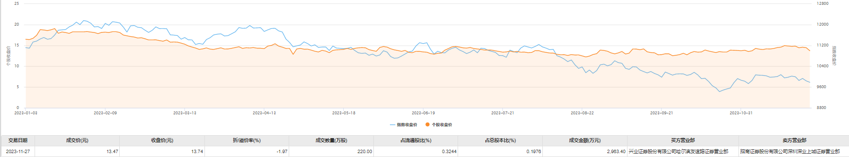 今日大宗交易成交220万股,成交额2963.4万元,占当日总成交额的9.39%,成交价13.47元,较市场收盘价折价1.97%。