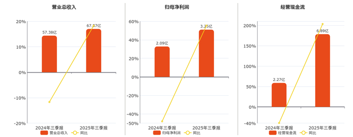 公司营业总收入为67.87亿元。归母净利润为3.25亿元。经营活动现金净流入为6.89亿元。