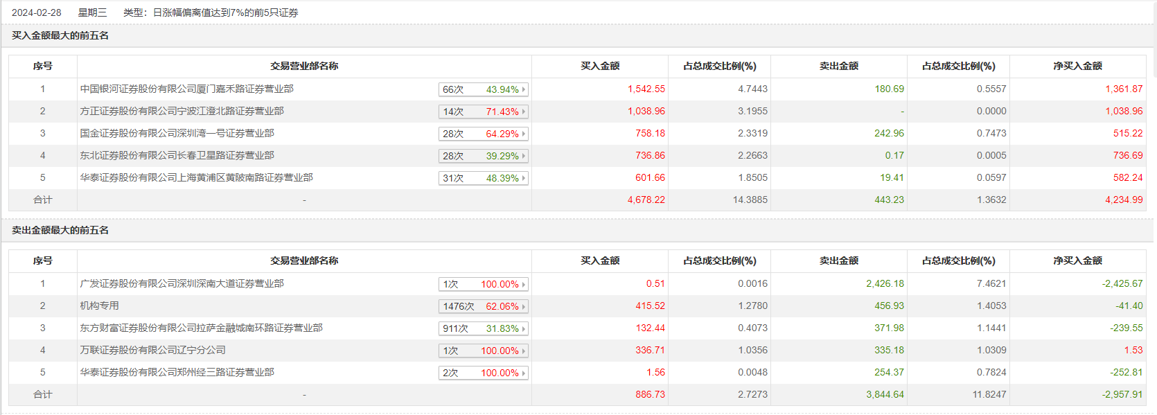 2月28日,洪涛股份今日涨停,龙虎榜数据显示,上榜营业部席位全天成交9852.81万元,占当日总成交金额比例为30.3%。其中,买入金额为5564.95万元,卖出金额为4287.87万元,合计净买入1277.08万元。