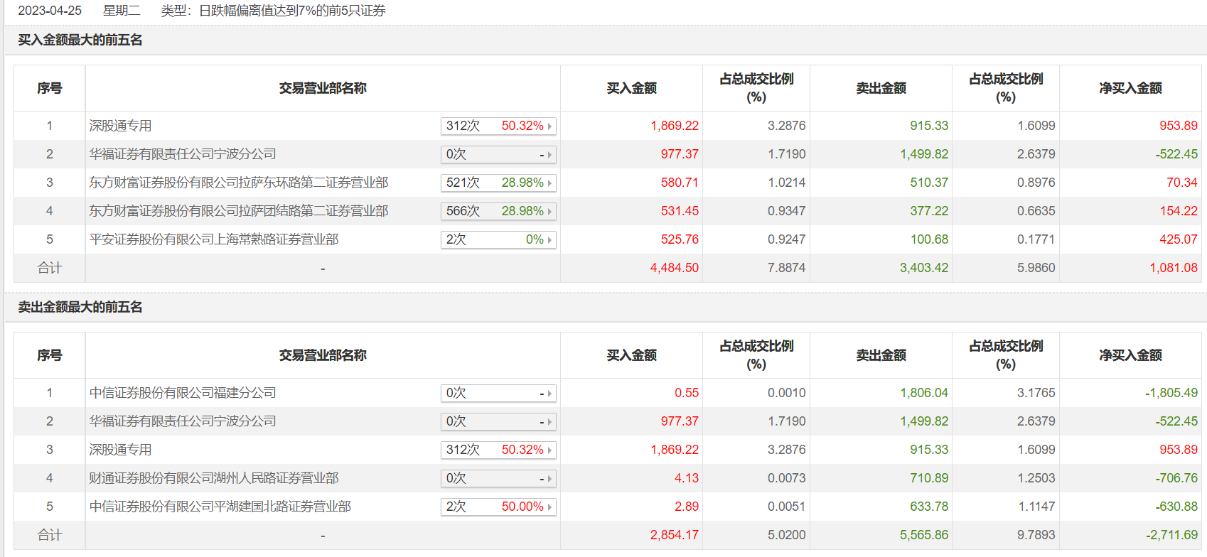 具体来看,中信证券福建分公司、华福证券宁波分公司分别卖出1806.04万元、1499.82万元;深股通专用、华福证券宁波分公司分别买入1869.22万元、977.37万元。
