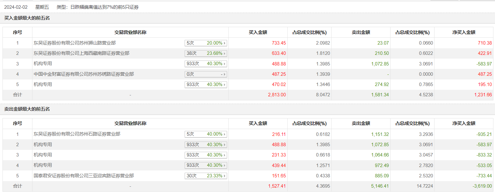 罗普斯金2月2日跌停,全天换手率达11.65%,振幅达14.67%。龙虎榜数据显示,营业部席位合计净卖出1803.37万元。其中,机构买入1629.68万元,卖出3384.92万元,合计净卖出1755.24万元。此外,东吴证券苏州石路证券营业部、国泰君安证券三亚迎宾路证券营业部分别卖出1151.32万元、885.09万元;东吴证券苏州狮山路营业部、东吴证券上海西藏南路证券营业部分别买入733.45万元、633.40万元。