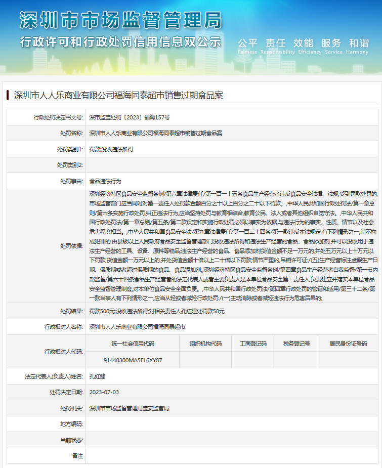 销售过期食品 深圳市人人乐商业有限公司福海同泰超市被罚