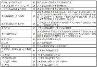 2023年1月12日,人人乐公告了《要约收购报告书》。收购人永乐商管公司向除西安曲江文化产业投资(集团)有限公司、深圳市浩明投资控股集团有限公司、深圳市人人乐咨询服务有限公司、何金明、张政以外的其他股东发出收购其所持有的上市公司全部无限售条件流通股的全面要约,要约收购股份数量107,282,034股,占人人乐总股本的24.38%,要约收购价格为5.88元/股。本次要约收购的期限为2023年1月13日至2023年2月13日,共计32个自然日。