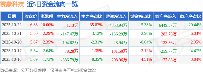 证券之星消息,赛象科技10月22日涨停收盘,收盘价6.38元。该股于10点27分涨停,1次打开涨停,截止收盘封单资金为5951.58万元,占其流通市值1.59%。