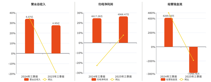 公司营业总收入为4.95亿元,在已披露的同业公司中排名第72,较去年同报告期营业总收入减少1.13亿元,同比较去年同期下降18.57%。归母净利润为4968.47万元,在已披露的同业公司中排名第58。经营活动现金净流入为-7548.76万元,在已披露的同业公司中排名第101,较去年同报告期经营活动现金净流入减少1.58亿元,同比较去年同期下降191.28%。