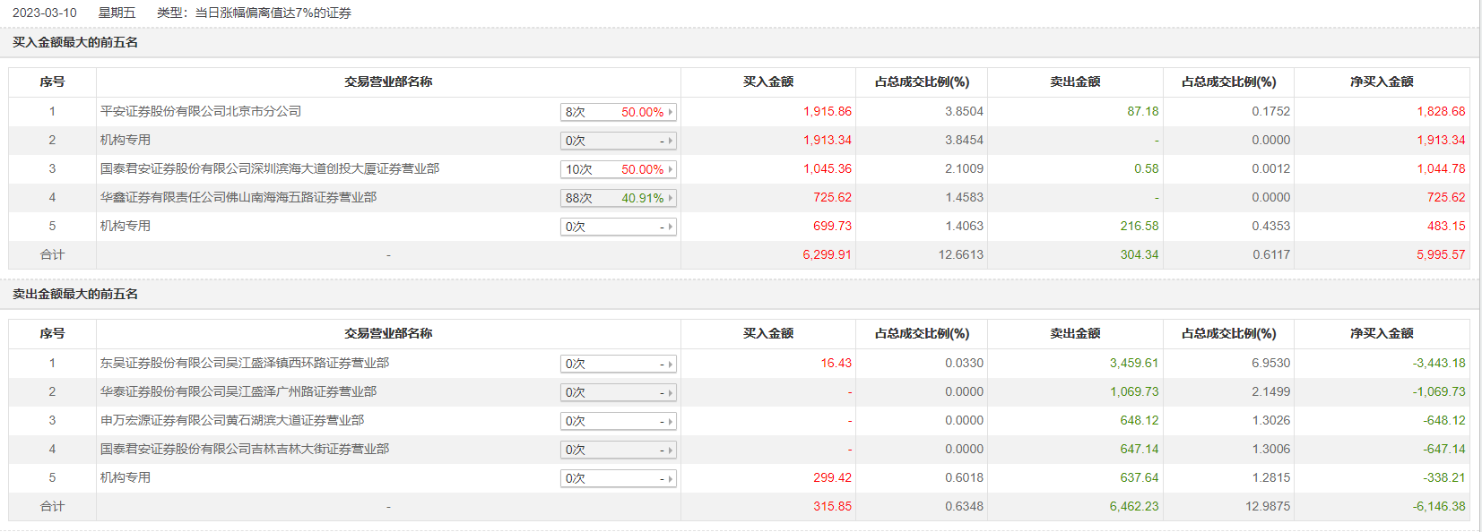具体来看,机构买入2912.5万元,卖出854.22万元,合计净买入2058.28万元。此外,平安证券北京市分公司、国泰君安证券深圳滨海大道创投大厦证券营业部分别买入1915.86万元、1045.36万元;东吴证券吴江盛泽镇西环路证券营业部、华泰证券吴江盛泽广州路证券营业部分别卖出3459.61万元、1069.73万元。