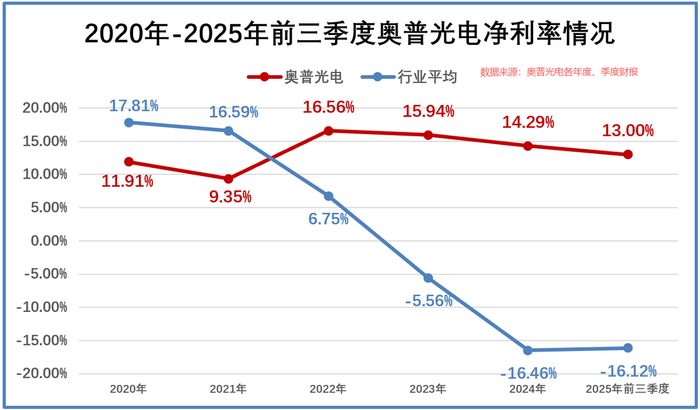自2020年起,我国光电行业整体处于需求受阻、盈利承压的状态,行业平均净利率从202年的17.81%急转直下,到2025年三季度已经降至-16.12%。