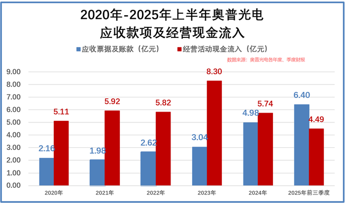 2023年至2025年三季度,奥普光电的存货从3.04亿元增至4.28亿元,应收票据及账款同步增至6.4亿元。