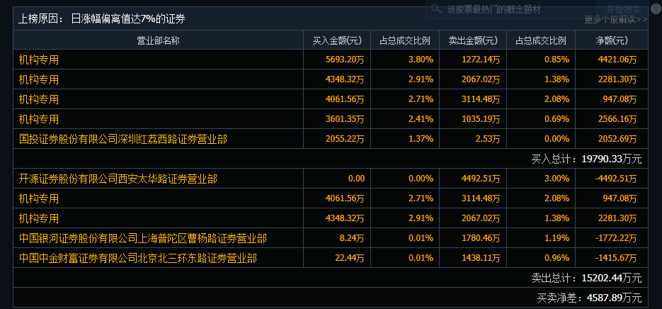 (002339)今日涨停,成交额14.97亿元,换手率24.89%,盘后龙虎榜数据显示,4家机构专用席位净买入1.02亿元。