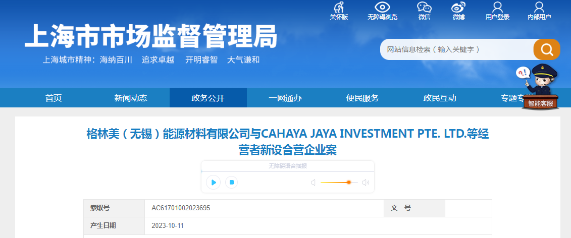 格林美(无锡)能源材料有限公司与CAHAYA JAYA INVESTMENT PTE. LTD.等经营者新设合营企业案