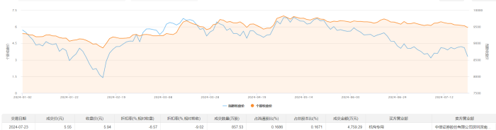 7月23日大宗交易成交857.53万股,成交额4759.29万元,占当日总成交额的10.68%,成交价5.55元,较市场收盘价5.94元折价6.57%。