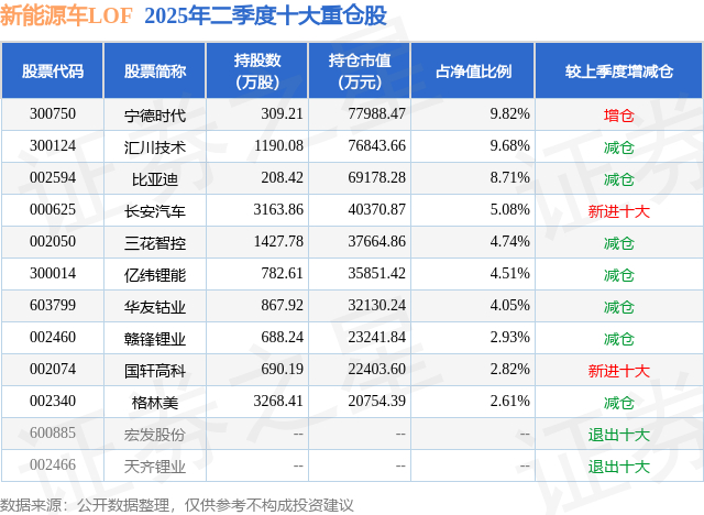 新能源车LOF的前十大重仓股如下:
