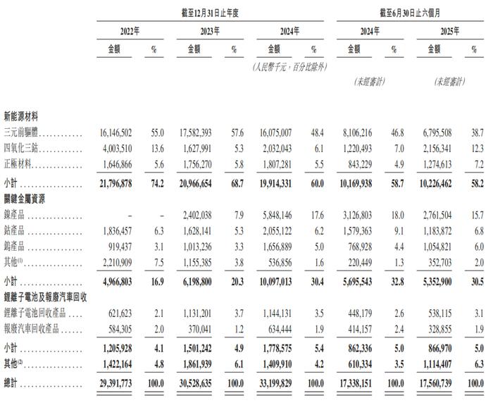 2025年上半年,格林美收入构成中,新能源材料业务占比58.2%,关键金属资源业务占比30.5%,另外还有11.3%的收入来自锂离子电池及报废汽车回收以及其他业务。