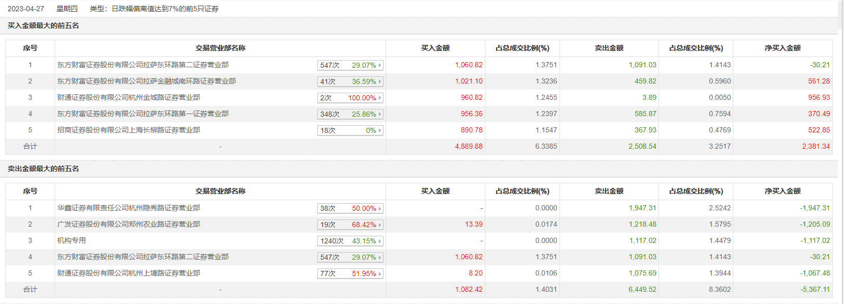 具体来看,机构合计净卖出1117.02万元。此外,华鑫证券杭州隐秀路证券营业部、广发证券郑州农业路证券营业部分别卖出1947.31万元、1218.48万元;东方财富证券拉萨东环路第二证券营业部、东方财富证券拉萨金融城南环路证券营业部分别买入1060.82万元、1021.10万元。