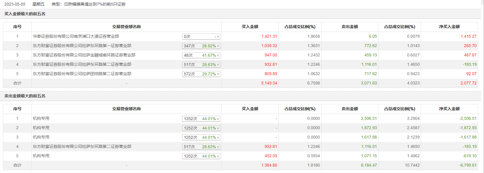 具体来看,机构买入452.05万元,卖出7068.47万元,合计净卖出6616.42万元。此外,东方财富证券拉萨东环路第二证券营业部、东方财富证券拉萨东环路第一证券营业部分别卖出1116.01万元、772.62万元;华泰证券南京浦口大道证券营业部、东方财富证券拉萨东环路第一证券营业部分别买入1421.31万元、1038.32万元。