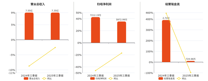 公司营业总收入为7.35亿元,较去年同报告期营业总收入减少1951.04万元,同比较去年同期下降2.59%。归母净利润为5972.99万元,较去年同报告期归母净利润减少1239.20万元,同比较去年同期下降17.18%。经营活动现金净流入为724.98万元,较去年同报告期经营活动现金净流入减少2.65亿元,同比较去年同期下降97.34%。