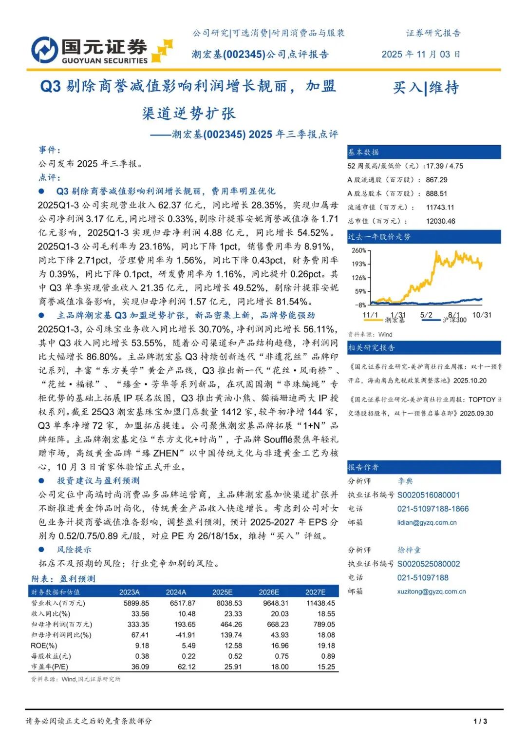 本报告摘自国元证券2025年11月3日已发布的《Q3剔除商誉减值影响利润增长靓丽,加盟渠道逆势扩张——潮宏基(002345) 2025年三季报点评》,具体报告及分析内容请详见报告。若因对报告的摘编等产生歧义,应以报告发布当日的完整内容为准。