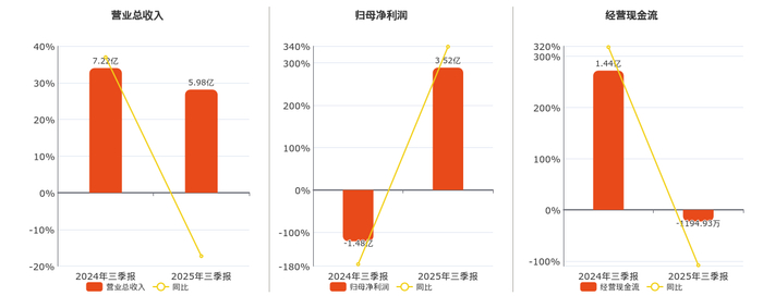 公司营业总收入为5.98亿元,在已披露的同业公司中排名第103,较去年同报告期营业总收入减少1.25亿元,同比较去年同期下降17.27%。归母净利润为3.52亿元。经营活动现金净流入为-1194.93万元,在已披露的同业公司中排名第87,较去年同报告期经营活动现金净流入减少1.56亿元,同比较去年同期下降108.32%。