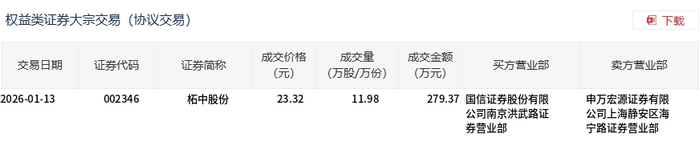 1月13日,柘中股份大宗交易成交11.98万股,成交额279.37万元,占当日总成交额的1.62%,成交价23.32元,较市场收盘价20.86元溢价11.79%。