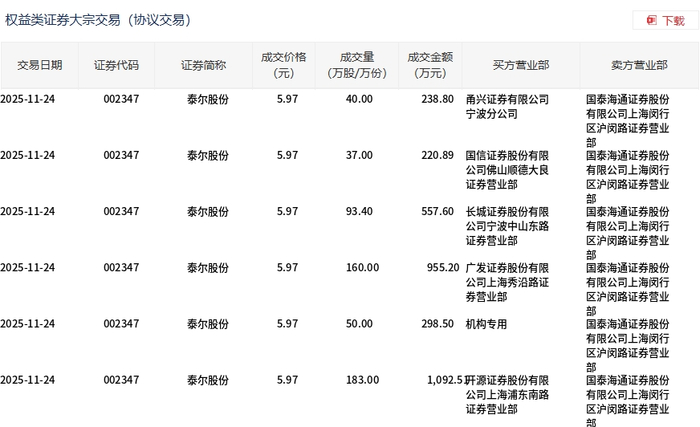 11月24日,泰尔股份大宗交易成交563.4万股,成交额3363.5万元,占当日总成交额的33.2%,成交价5.97元,较市场收盘价6.74元折价11.42%。
