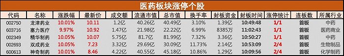今天,A股医药板块震荡拉升,截至发稿,龙津药业、塞力医疗、双城药业、神奇制药精华制药纷纷涨停。