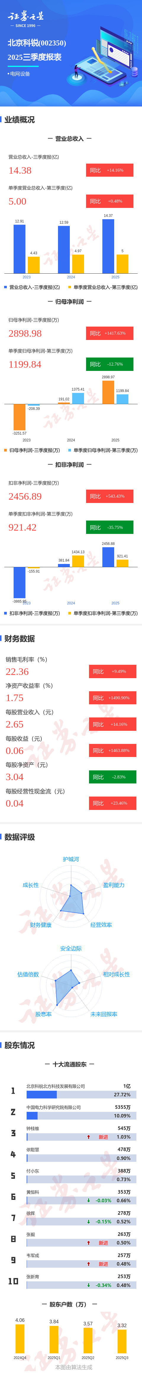 证券之星消息,北京科锐2025年三季报显示,公司主营收入14.38亿元,同比上升14.16%;归母净利润2898.98万元,同比上升1417.63%;扣非净利润2456.89万元,同比上升543.43%;其中2025年第三季度,公司单季度主营收入5.0亿元,同比上升0.49%;单季度归母净利润1199.84万元,同比下降12.77%;单季度扣非净利润921.42万元,同比下降35.75%;负债率41.62%,投资收益374.56万元,财务费用302.07万元,毛利率22.36%。