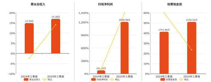 公司营业总收入为14.38亿元。归母净利润为2898.98万元,在已披露的同业公司中排名第67。经营活动现金净流入为2150.52万元,在已披露的同业公司中排名第44。