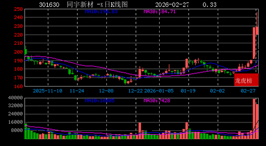 截止收盘,同宇新材报收229.0元/股,涨幅0.33%,成交量3万手,成交额7.75亿元,换手率33.38%。今日未涨停。