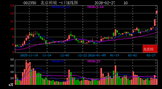截止收盘,北京科锐报收12.32元/股,涨幅10.0%,成交量17万手,成交额2.15亿元,换手率3.33%。今日2板。