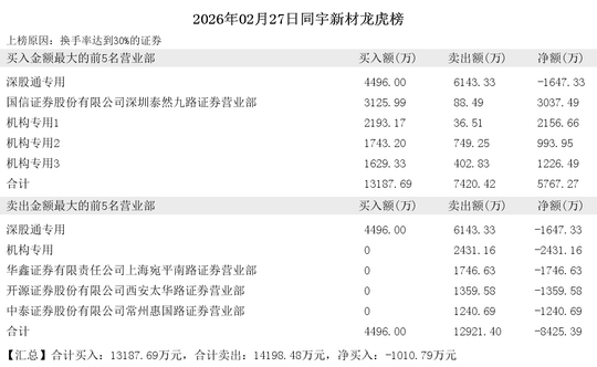卖出前5席为:深股通专用、机构专用、华鑫证券有限责任公司上海宛平南路证券营业部、开源证券股份有限公司西安太华路证券营业部、中泰证券股份有限公司常州惠国路证券营业部。共计买入:4496.00万元,共计卖出:12921.40万元。