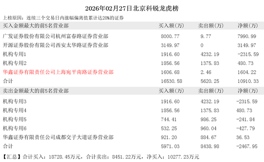 卖出前5席为:机构专用3、机构专用4、机构专用5、机构专用6、华鑫证券有限责任公司成都交子大道证券营业部。共计买入:5971.03万元,共计卖出:8438.98万元。