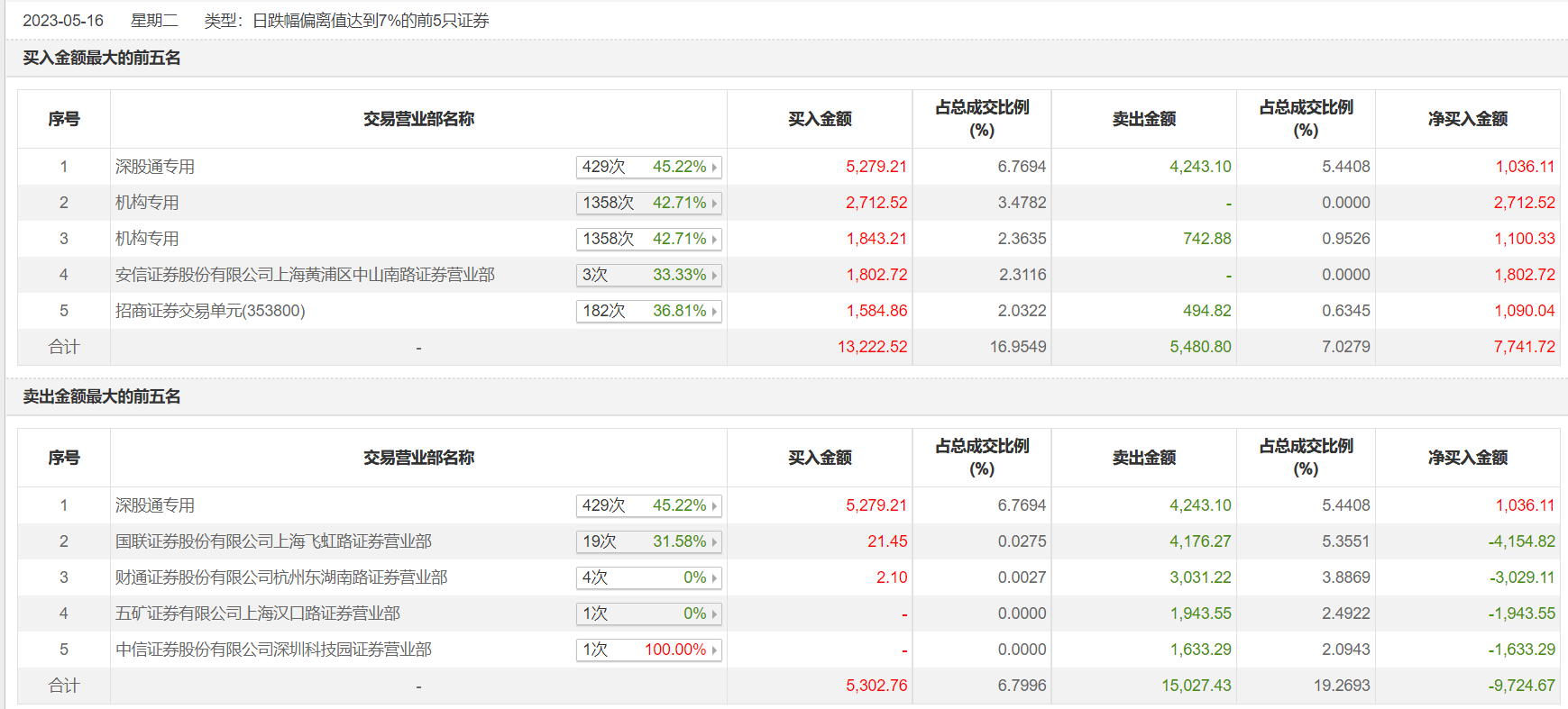 具体来看,机构买入4555.73万元,卖出742.88万元,合计净买入3812.85万元。此外,深股通专用、国联证券上海飞虹路证券营业部分别卖出4243.10万元、4176.27万元;深股通专用、安信证券上海黄浦区中山南路证券营业部分别买入5279.21万元、1802.72万元。