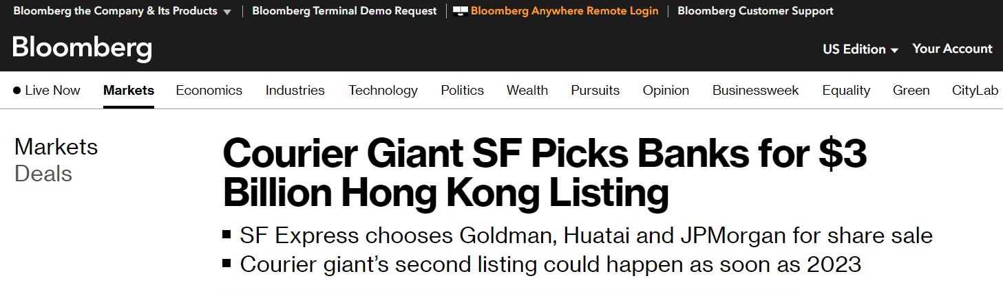 据报道,顺丰控股正与高盛集团、华泰证券和摩根大通等银行安排香港上市的相关事宜。