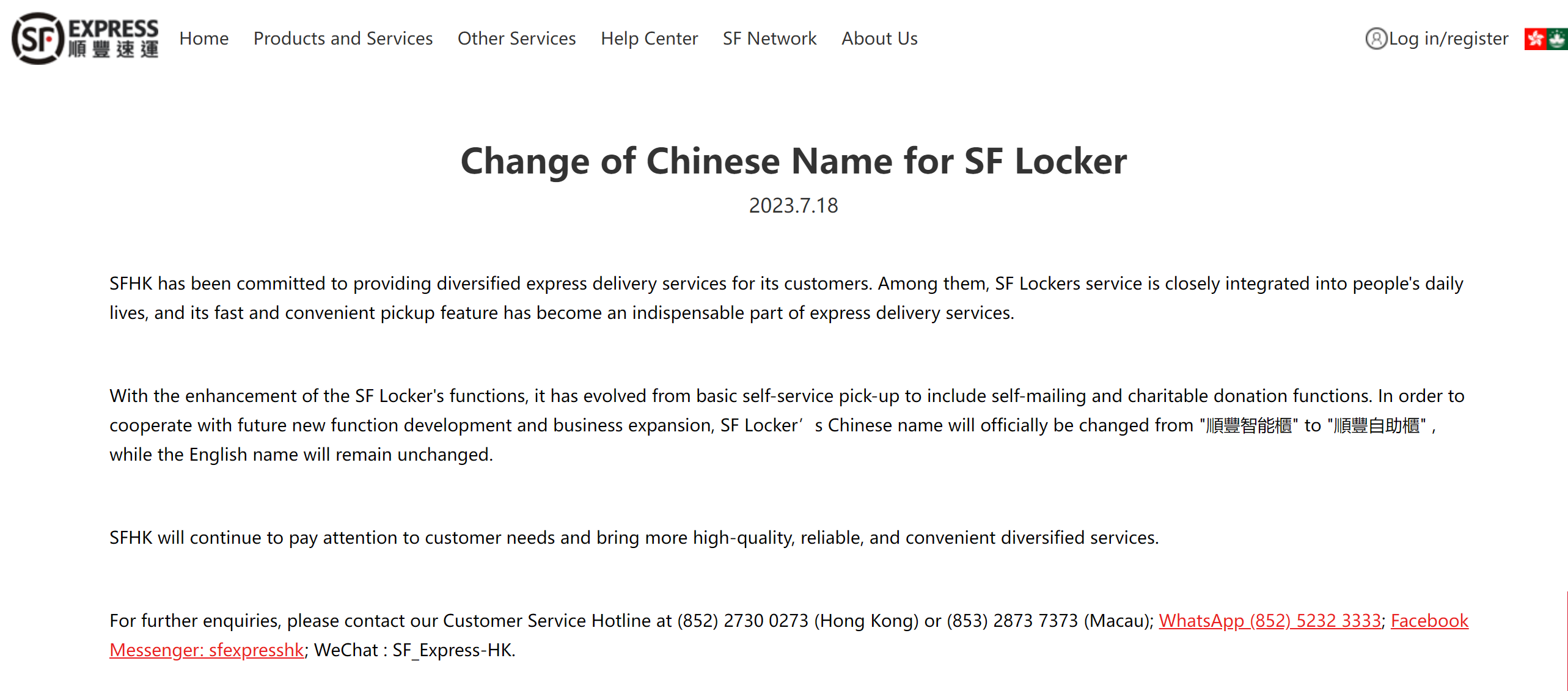 顺丰速运7月18日在香港官网公告,随着顺丰储物柜功能的不断增强,为配合未来新功能开发和业务拓展,顺丰智能柜中文名称将正式由“顺丰智能柜”更名为“顺丰自助柜”,英文名称维持不变。
