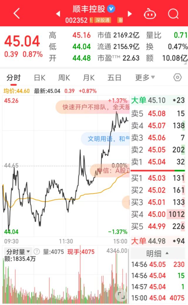 截至发稿(13日16时04分),顺丰控股A股上涨0.87%,报收45.04元,成交10.08亿元,换手率0.47%,总市值2169.2亿元。