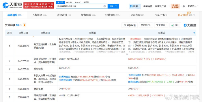 天眼查App显示,近日,顺丰控股(002352.SZ)发生工商变更,注册资本由约49.9亿人民币增至约50.4亿人民币。值得一提的是,今年8月,该公司注册资本由约48.2亿人民币增至约49.9亿人民币。