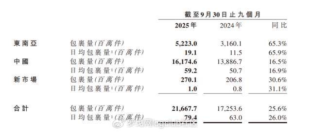 前三季度,极兔总包裹量达216.7亿件,同比增长25.6%,整体表现稳健。其中,东南亚市场持续领跑,包裹量52.23亿件(+65.3%),稳居区域头部;中国市场包裹量161.7亿件(+16.5%),保持韧性;新兴市场初见成效,包裹量约2.7亿件,同比大增30.6%,成为未来增长的新引擎。