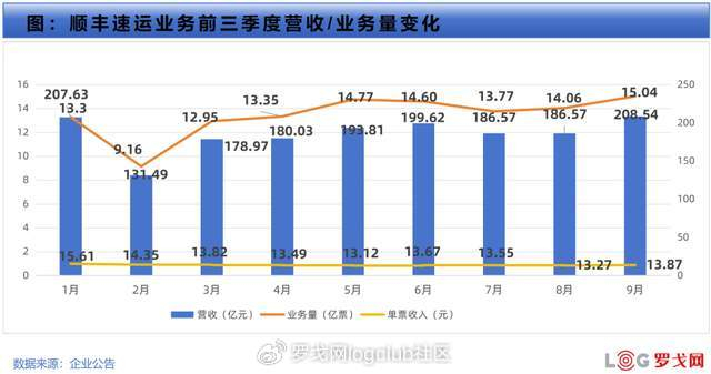 前三季度,顺丰营收2252.61亿元,同比增长8.89%;归母净利润83.08亿元,同比增长9.07%。其中,速运业务营收达1673.23亿元,同比增长11.66%;业务量达到121亿件,同比增长28.34%,增速连续多月领跑行业,5月至9月更是连续五个月超30%。