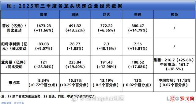 但从长周期来看,只要规模没有被拉大,第三第四之争似乎没那么重要。毕竟,在当前快递行业估值逻辑已从“拼规模”转向“看质量、比韧性”的背景下,守住基本盘比短期排名更重要。市场如今更关注的是网络稳定性、盈利可持续性、技术投入与降本能力。