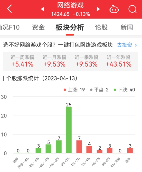 中国经济网北京4月13日讯今日,网络游戏板块整体跌幅0.13%,其中19只股票上涨,2只股票平盘,40只股票下跌。