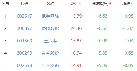 恺英网络、协创数据、三六零、富春股份、巨人网络位列涨幅榜后五位,涨幅分别为-6.63%、-6.62%、-6.09%、-5.85%、-5.39%。