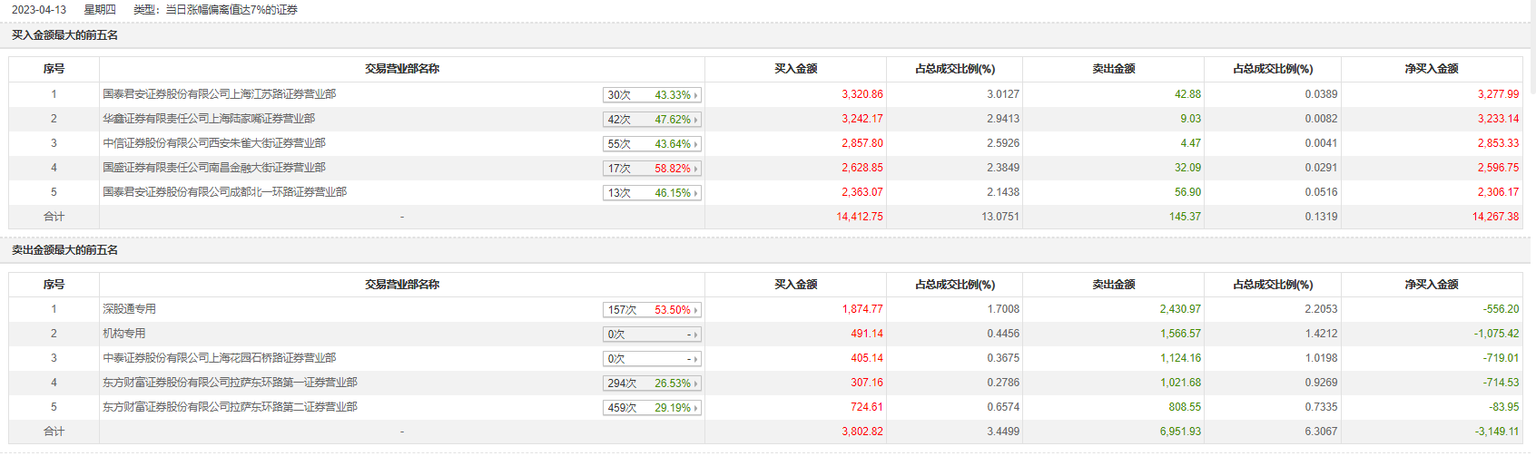 4月13日,天娱数科今日涨停,龙虎榜数据显示,上榜营业部席位全天成交2.53亿元,占当日总成交金额比例为22.96%。其中,买入金额为1.82亿元,卖出金额为7097.3万元,合计净买入1.11亿元。