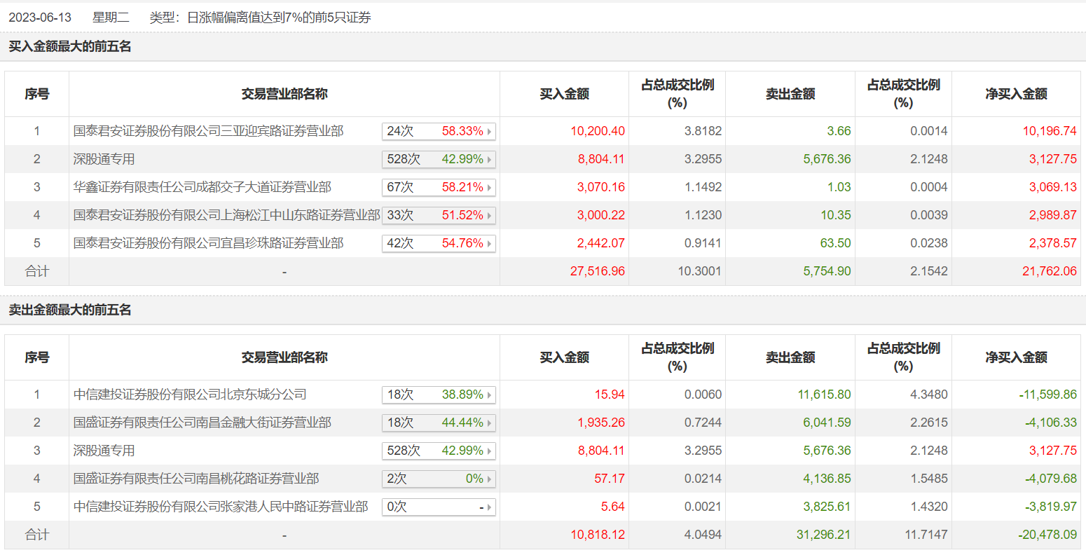 具体来看,国泰君安证券三亚迎宾路证券营业部、深股通专用分别买入1.02亿元、8804.11万元;中信建投证券北京东城分公司、国盛证券南昌金融大街证券营业部分别卖出1.16亿元、6041.59万元。