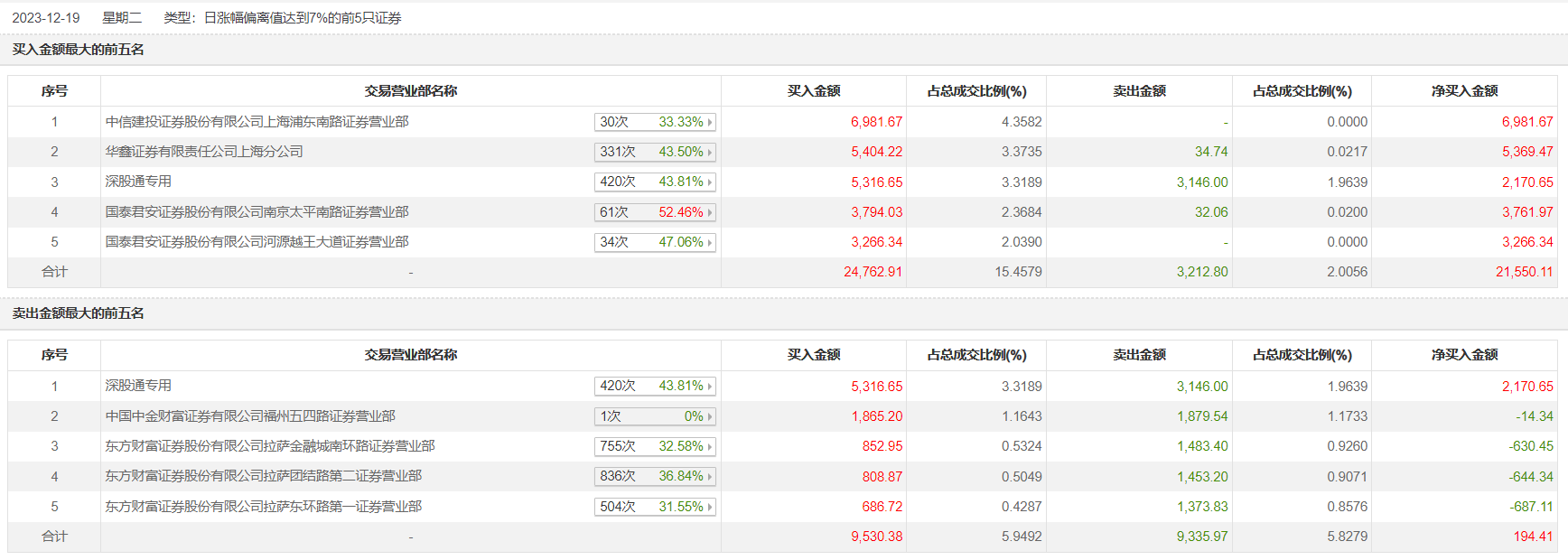 天娱数科12月19日涨停,龙虎榜数据显示,上榜营业部席位全天成交3.84亿元,占当日总成交金额比例为23.96%。其中,买入金额为2.9亿元,卖出金额为9402.77万元,合计净买入1.96亿元。具体来看,知名游资现身龙虎榜,作手新一(国泰君安证券股份有限公司南京太平南路证券营业部)净买入3761.97万元。此外,中信建投证券上海浦东南路证券营业部、华鑫证券上海分公司分别买入6981.67万元、5404.22万元;深股通专用、中国中金财富证券有限公司福州五四路证券营业部分别卖出3146.00万元、1879.54万元。