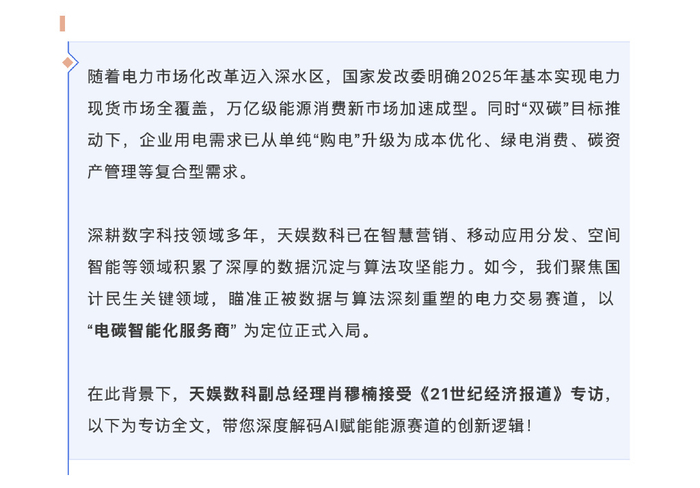 媒体专访丨天娱数科对话21世纪经济报道:AI化身电力市场“智能引擎”