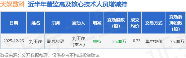证券之星消息,根据12月29日市场公开信息、上市公司公告及交易所披露数据整理,天娱数科(002354)最新董监高及相关人员股份变动情况:2025年12月26日公司副总经理刘玉萍共减持公司股份25.0万股,占公司总股本为0.0151%。变动期间公司股价下跌0.16%,12月26日当日收盘报6.23元。