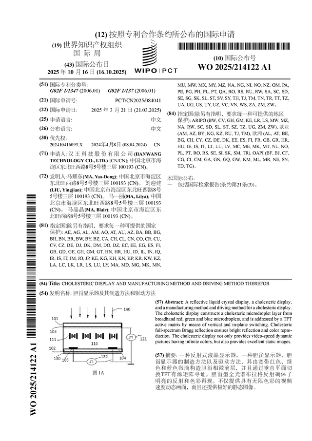 汉王科技公布国际专利申请:“胆甾显示器及其制造方法和驱动方法”