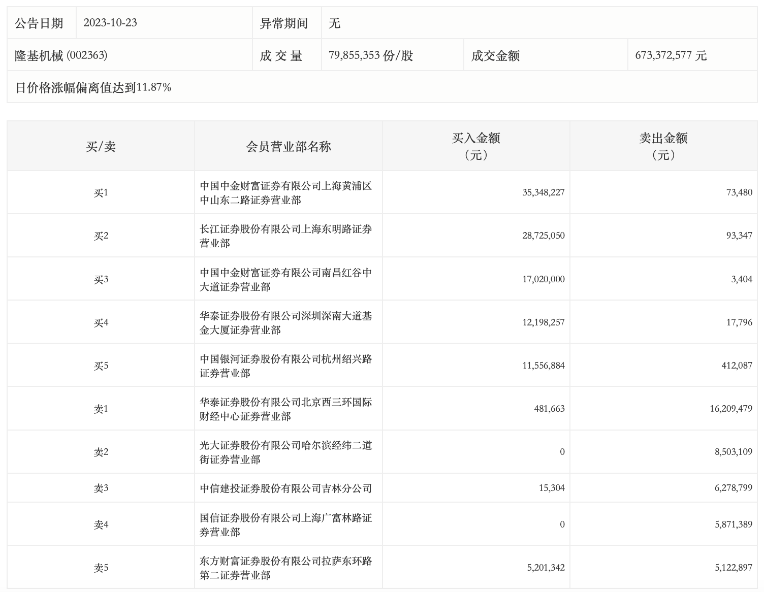 10月23日,隆基机械今日涨停,全天换手率达19.21%,振幅达13.05%。龙虎榜数据显示,营业部席位合计净买入6796.09万元。其中,中国中金财富证券有限公司上海黄浦区中山东二路证券营业部、长江证券上海东明路证券营业部分别买入3534.82万元、2872.51万元;华泰证券北京西三环国际财经中心证券营业部、光大证券哈尔滨经纬二道街证券营业部分别卖出1620.95万元、850.31万元。